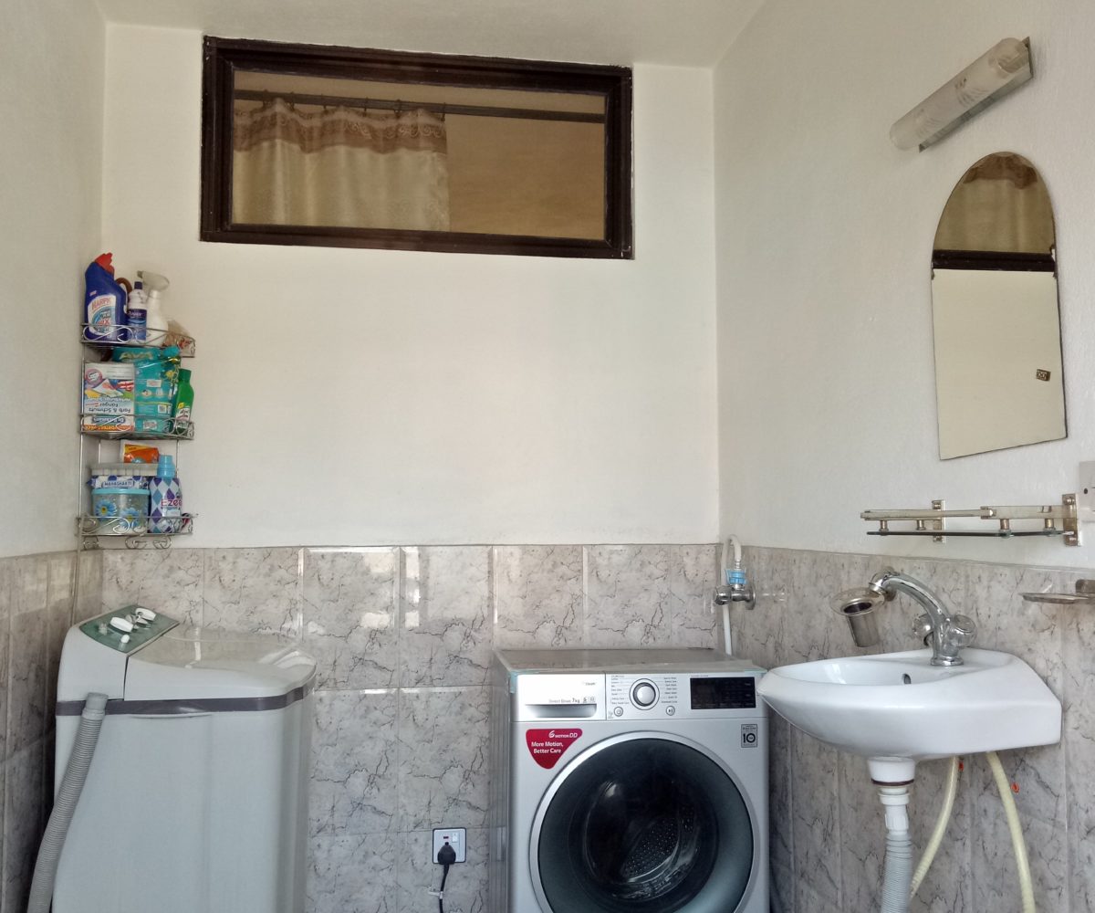 The guest gets a private room and a private bath to him/herself for the time of their stay. There is a washing area with automatic and semi automatic washine machines that is shared by the house members.